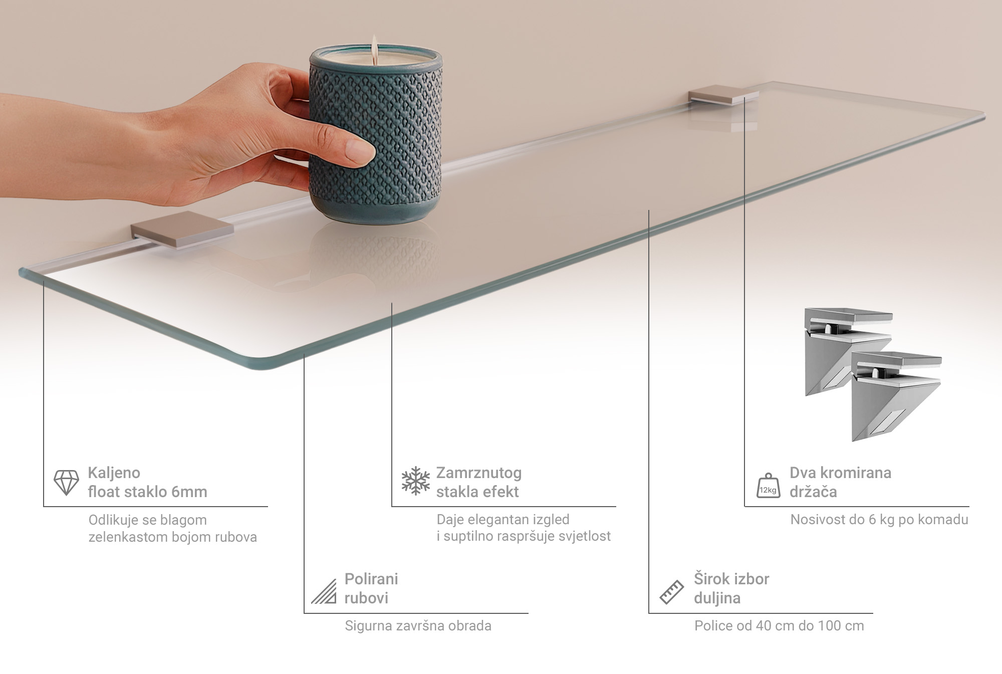 Staklena zidna polica u poluprozirnom izdanju predstavlja elegantnu, suptilnu površinu koja kombinira prozračnost i mat teksturu. Tafla kaljenog stakla u poluprozirnom tonu daje mekani, difuzni sjaj bez oštrih refleksija, dok izbrušeni rubovi naglašavaju preciznost izrade. Oblik pravokutnika i tanak profil od 6 mm stvaraju osjećaj laganosti i vizualnog prozračnog prostora, a mat završna folija dodaje baršunastu, gotovo svilenkastu teksturu na dodir.